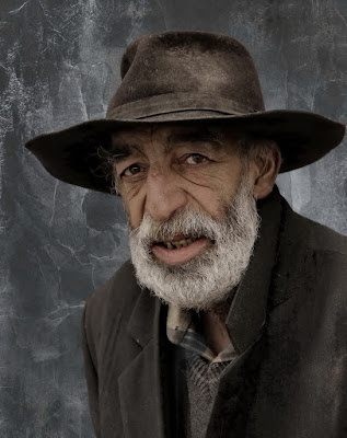 É um homem forte com mãos grossas e botas de trabalho bem gastas. Usa uma sweatshirt cinzenta com capuz e uma jeans azuis já esquecidas do cheiro do sabão.